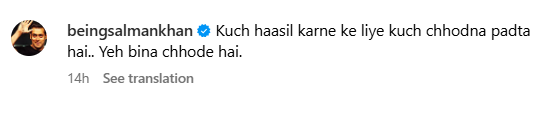 सलमान ने अपने आधिकारिक इंस्टाग्राम अकाउंट से एक तस्वीर शेयर की, जिसमें वो शर्टलेट हैं। फोटो में उनके एब्स साफ नजर आ रहे हैं। इस तस्वीर के साथ एक्टर ने लिखा है, ‘कुछ हासिल करने के लिए कुछ छोड़ना पड़ता है। ये बिना छोड़े है।’