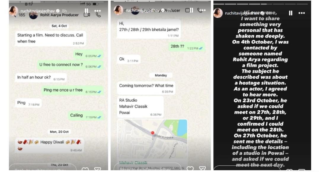 रुचिता ने लिखा— “4 अक्टूबर को मुझे वाट्सऐप पर एक मैसेज आया था। उसने खुद को फिल्म निर्माता बताया और कहा कि वह ‘होस्टेज सिचुएशन’ पर फिल्म बना रहा है। उसने मिलने की तारीख पूछी और मुझे 27 अक्टूबर को पवई के एक स्टूडियो बुलाया था। लेकिन पारिवारिक कारणों से मैंने मीटिंग रद्द कर दी।”
